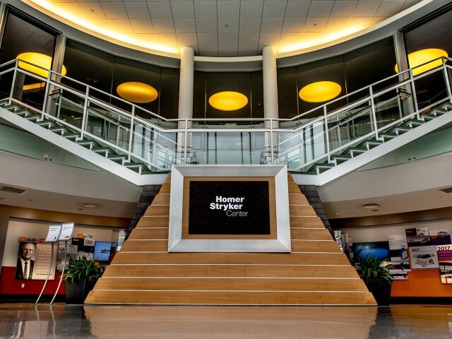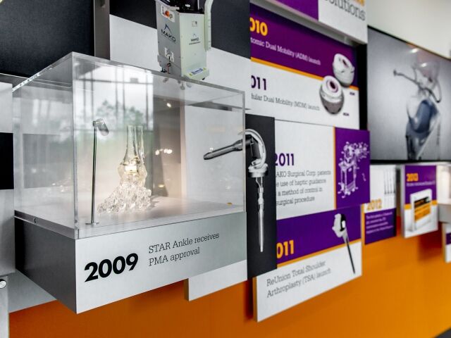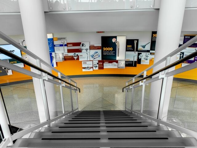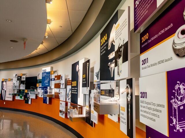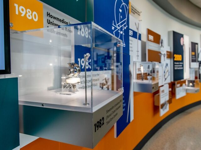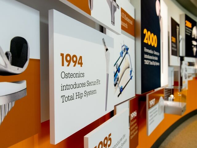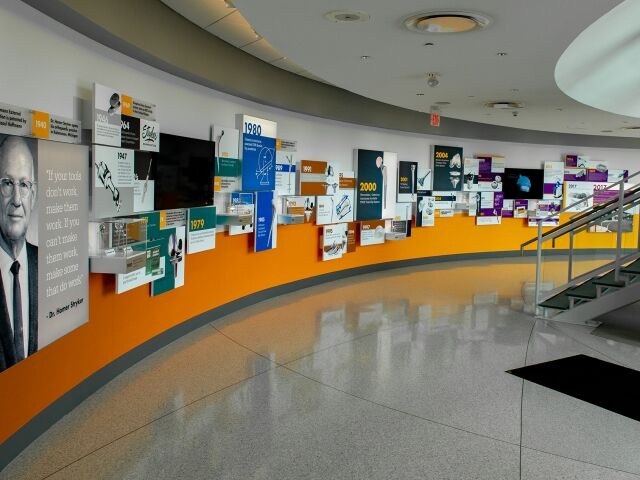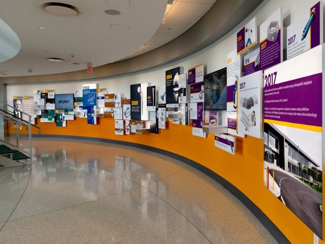 Dimensional was chosen to help Stryker in the redesign and update of the Homer Stryker Center’s main lobby. We designed, fabricated and installed an eye-catching 76 ft. long timeline display that not only serves as the centerpiece of the lobby but also educates visitors and employees on the company’s rich culture and history of innovation. The timeline’s design successfully utilizes backlit fabric graphics, plexi-glass artifact showcases, informational graphics and multimedia to wow visitors and tell the Stryker story.