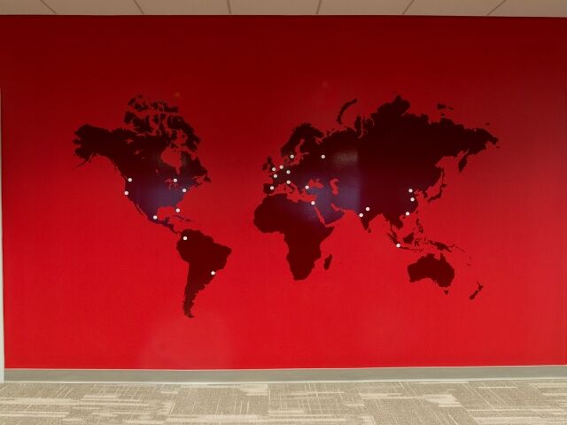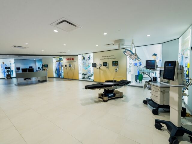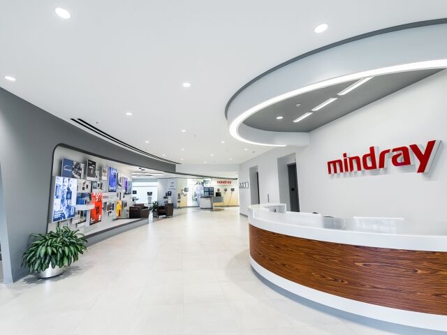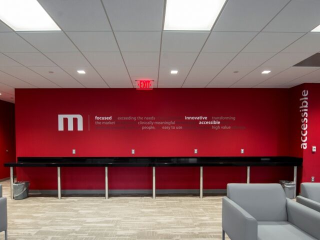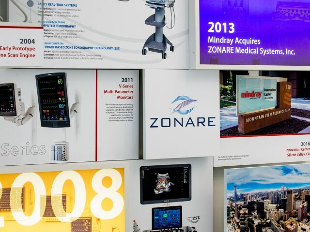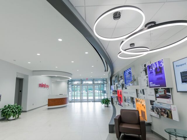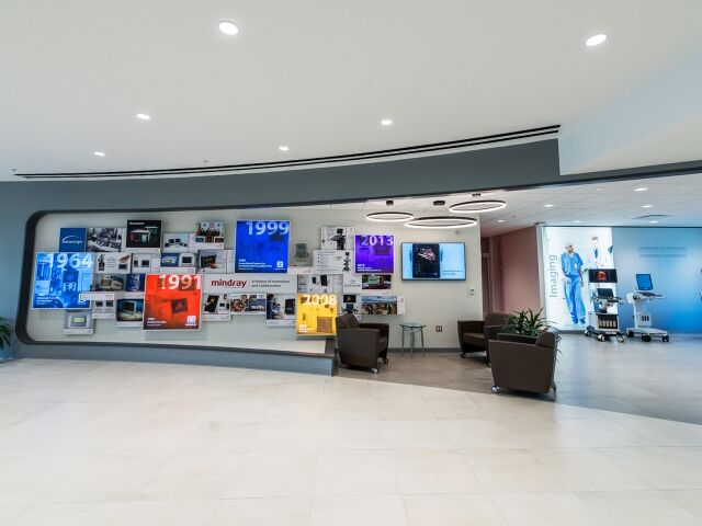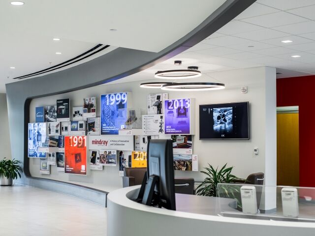 Working with Mindray’s internal marketing team, DimensionalWorldwide transformedthe lobby of the company’s North American headquarters into an engaging space that highlighted their rich history of innovation and integration. The centerpiece of the new lobby was a timeline wall built into the sweeping architecture of the building. Lightboxes, plexi-glass showcases and informational graphics were incorporated and stepped on different levels to create a dynamic design. In addition, the layout of the space was re-worked so that the expanded the lobby area flowed into the revamped product showroom, which featuredbacklit fabric SEG walls.